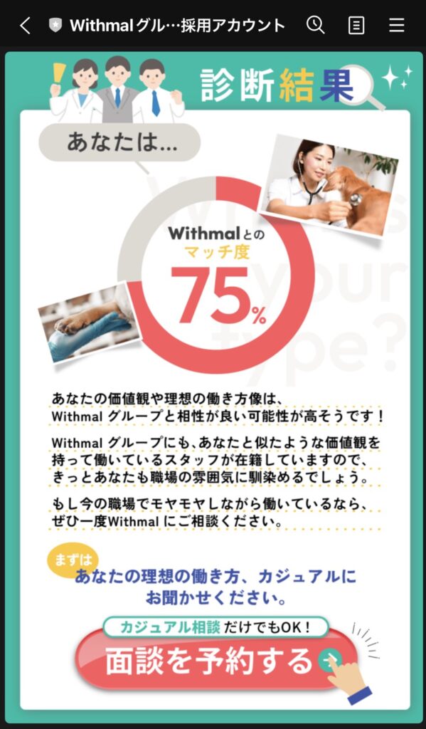動物病院業界では未だ多くの採用が外部媒体や人材紹介に依存する中、Withmalグループ様では“自社で採用を回せる状態”を目指し、LP × LINE × 広告を一体化した、独自の採用ファネルを構築。